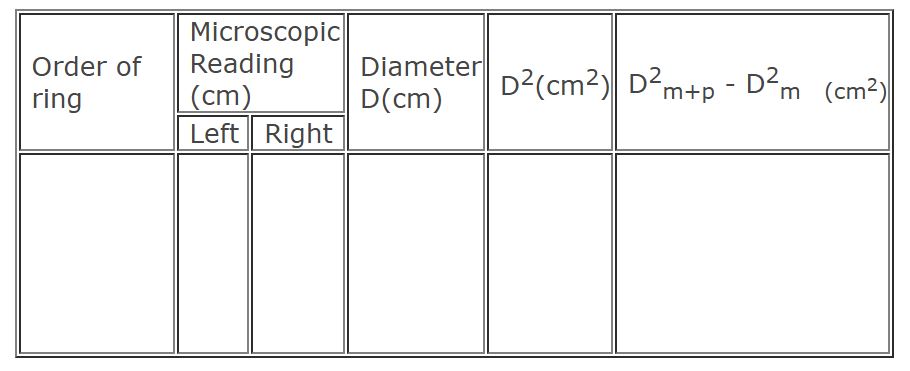 After experimental arrangement, the glass plate is inclined at an angle to the horizontal.This glass plate reflects light from the source vertically downwards and falls normally on the convex lens. Newton's rings are seen using a long focus microscope, focussed on the air film. The cross-wire of the microscope is made tangential to the 20th ring on the left side of the centre. The readings of the main scale and vernier scale of the microscope are noted. The cross wire is adjusted to be tangential to the 18th, 16th, 14th, etc on the left and 2nd, 4th, 6th, etc on the right and readings are taken each time. From this the diameter of the ring is found out which is the difference between the readings on the left and right sides. The square of the diameter and hence Dn2 and D2n+m are found out. Then wavelength is calulated using equation.